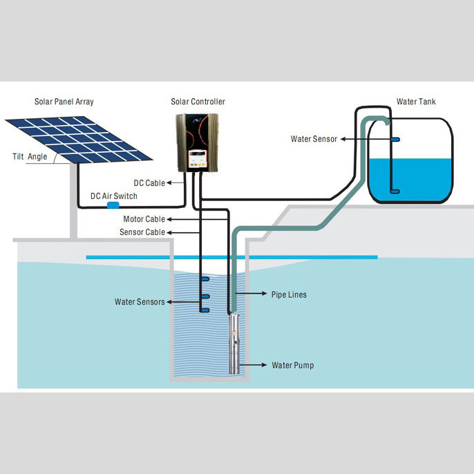 Solar pump system: It consists of pump body, motor, water pipe, cable, protection devices, water level sensor