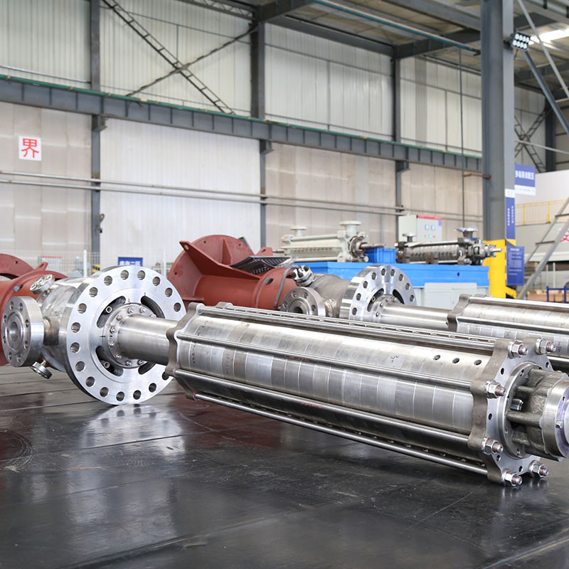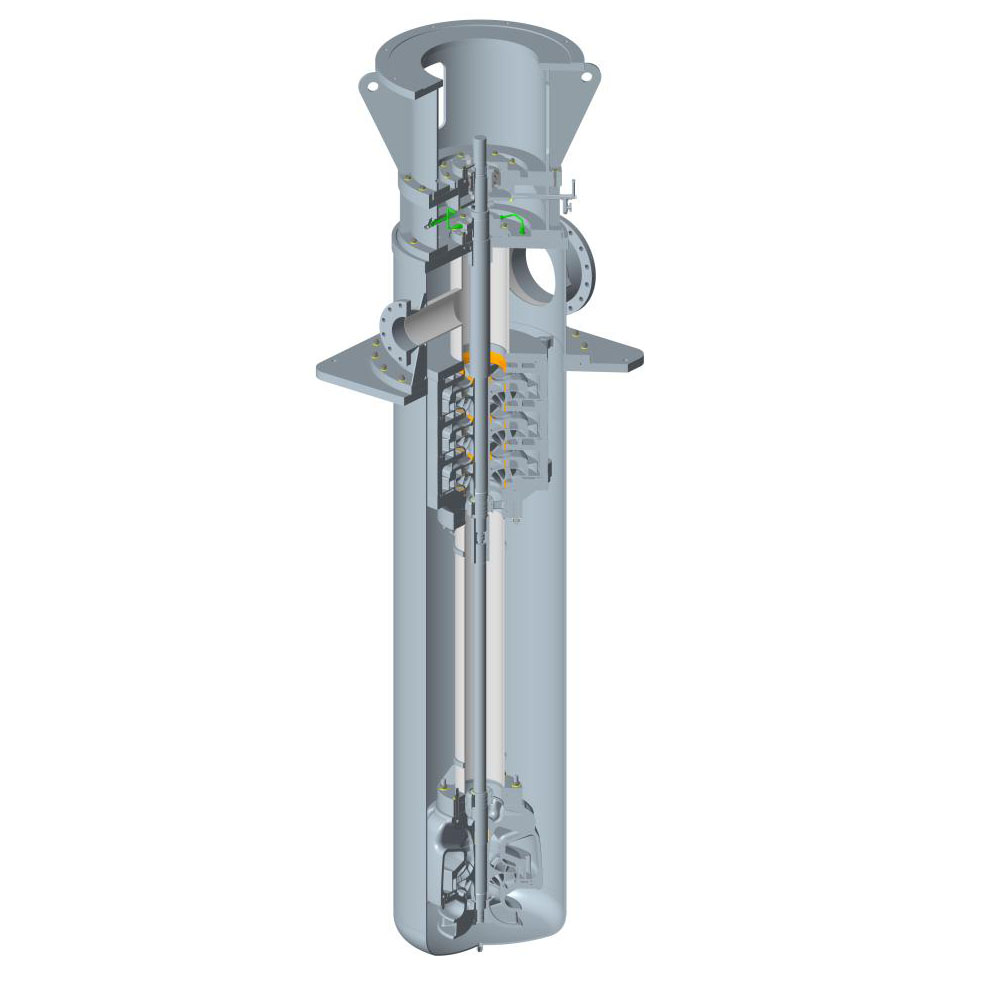 Vertical installation of the bag pump, multi-stage, radial split, cylindrical shell, the first stage of the use of anti-cavitation performance of the impeller. In the case of a large differential pressure, the balance drum structure is used to balance the axial force, and the residual axial force is received by the angular contact ball bearings in pairs. The housing is only subjected to inlet pressure, and the length of the housing and the depth of installation of the pump are determined by the NPSH cavitation performance requirements..